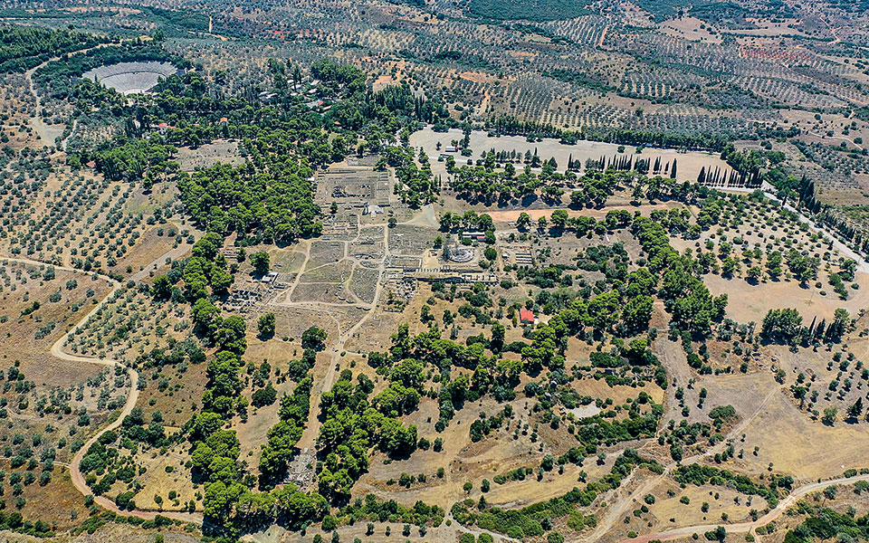 Αεροφωτογραφία του Ασκληπιείου της Επιδαύρου από τα βόρεια. Διακρίνεται το κυκλικό οικοδόμημα, δηλαδή η Θόλος. Στα αριστερά, διακρίνεται η ανασκαφή του αρχαϊκού κτιρίου. Στο βάθος, αριστερά, βλέπουμε το αρχαίο θέατρο.