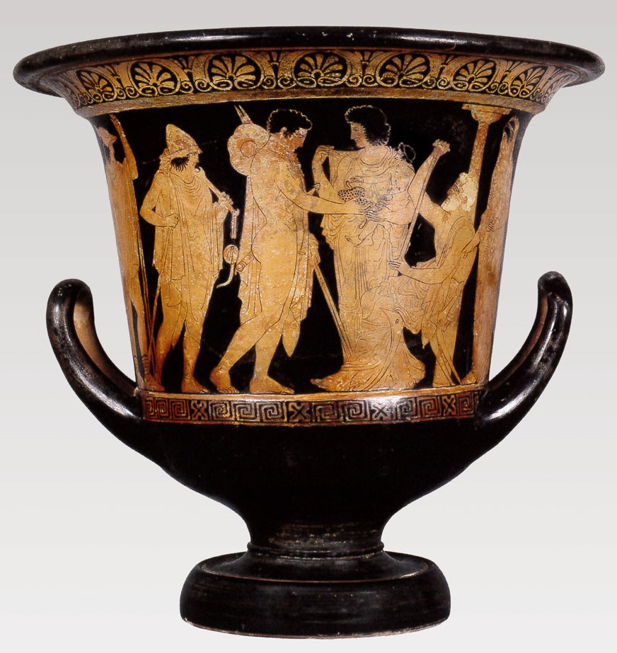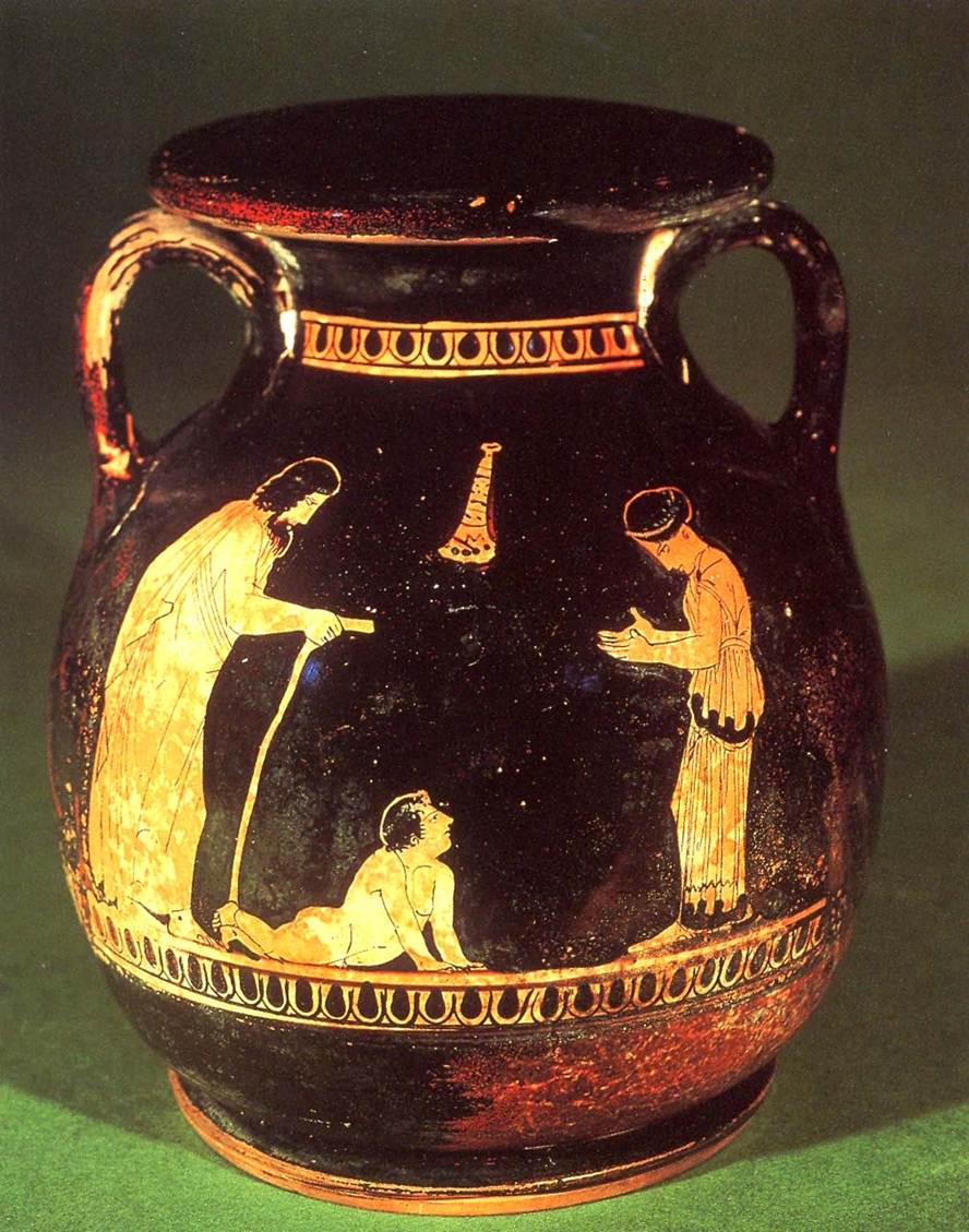 Ο διδάσκαλος κρατάει έναν πάπυρο πάνω στον οποίο είναι γραμμένο ένα επικό κείμενο, ΜΟΙΣΑ ΜΟΙ ΑΜΦΙ ΣΚΑΜΑΝΔΡΟΝ ΕΥΡΟΟΝ ΑΡΧΟΜΑΙ ΑΕΙΔΕΙΝ. Ένας μαθητής μπροστά του παρακολουθεί προσεκτικά. Πίσω του κάθεται ο παιδαγωγός του. Δίπλα του γίνονται μαθήματα μουσικής. Στην άλλη πλευρά τού αγγείου με ανάλογη σκηνή, στη μέση κάθεται ο υποδιδάσκαλος, ο οποίος κρατάει μια πινακίδα και γράφει κάτι, το οποίο θα κληθεί ο μαθητής που στέκεται πάλι μπροστά του να αντιγράψει. Τέτοιες πινακίδες, που ήταν φτιαγμένες από ξύλο αλειμμένο με κερί και μεταλλικοί στύλοι με τους οποίους χαράσσονταν τα γράμματα πάνω τους, έχουν σωθεί από υστερότερους κυρίως χρόνους.