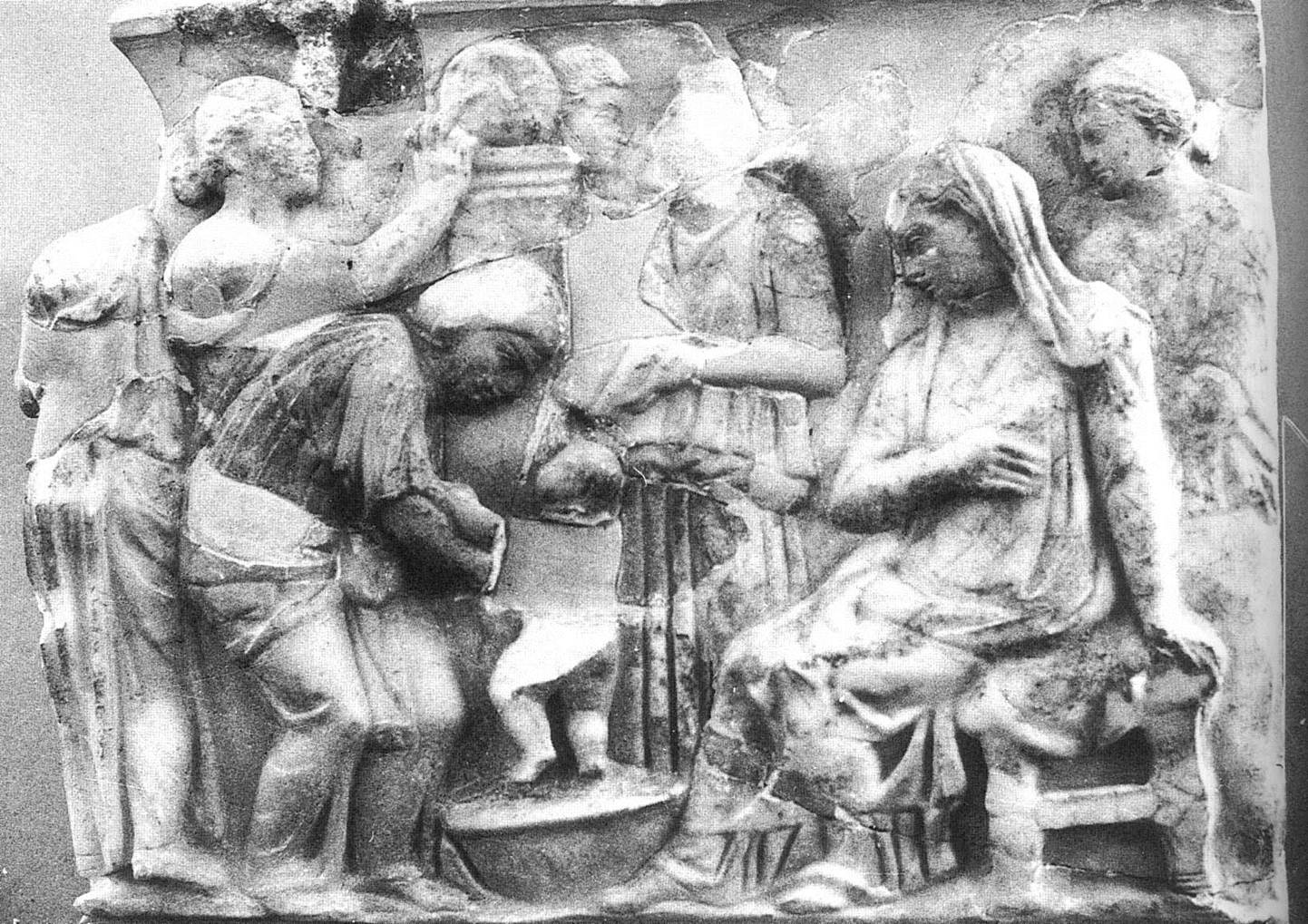 «Το τέκνον τής θυγατέρας μου κρατώ εδώ το αγαπητό, που κρατούσα στα γόνατά μου, όταν ζωντανοί βλέπαμε το φως τού ήλιου και τώρα νεκρό το κρατώ, εγώ η νεκρή”. Περ. 430-420 π.Χ., Μουσείο Κεραμεικού.